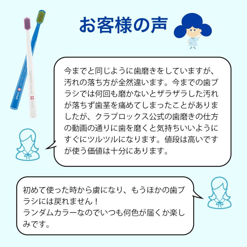 そして毛の植毛本数は普通の歯ブラシの約2-10倍(比較数字は毎日新聞記事「疑問氷解」から抜粋)CS5460はその名の通り、植立本数が5,460本。この超極細毛と圧倒的な植毛本数により、歯茎を傷めることなく毛先が歯頚部や列溝、歯間に深く入り込みます。さらに毛には自社開発ポリエステルのCUREN®(クーレン)繊維を使用しているので、柔らかいながらも弾力に富み、長持ちし経済的です。クリームチーズのような柔らかさに、チョコレートバターのような粘着度、是非、体感して下さい。