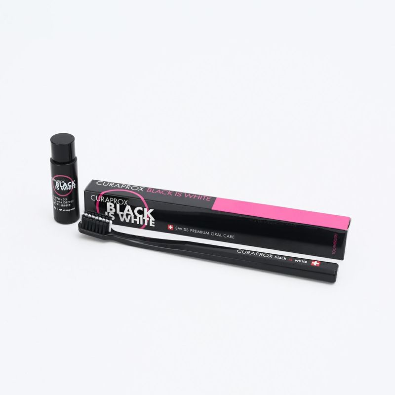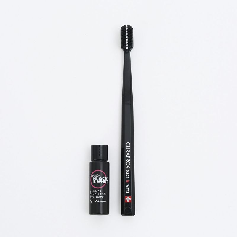 新製品パウダーはみがき5gと、スタイリッシュなデザインと「カーボン」配合で人気のブラックイズホワイト 歯ブラシ(黒)とのセットです。